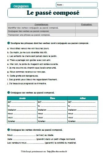 Le passé composé créé par vero7000 avec . Je vous propose ici des fiches d'exercices accompagnées d'exercices. On emploie l'imparfait ou le passé composé lorsqu'on parle ou écr. Pour chaque phrase, souligne le verbe conjugué au passé composé s'il y en a un. Fiches d'exercices en conjugaison pour cm2 .